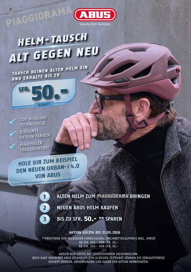 Quel âge a ton casque ? Échange dès maintenant ton casque (toutes marques confondues) et profite d’un nouveau casque ABUS ! Doté d’une technologie de pointe, de couleurs élégantes et d’un confort de port maximal. Économise jusqu’à CHF 50.– grâce à notre offre de reprise (action valable jusqu’au 31.05.2026).